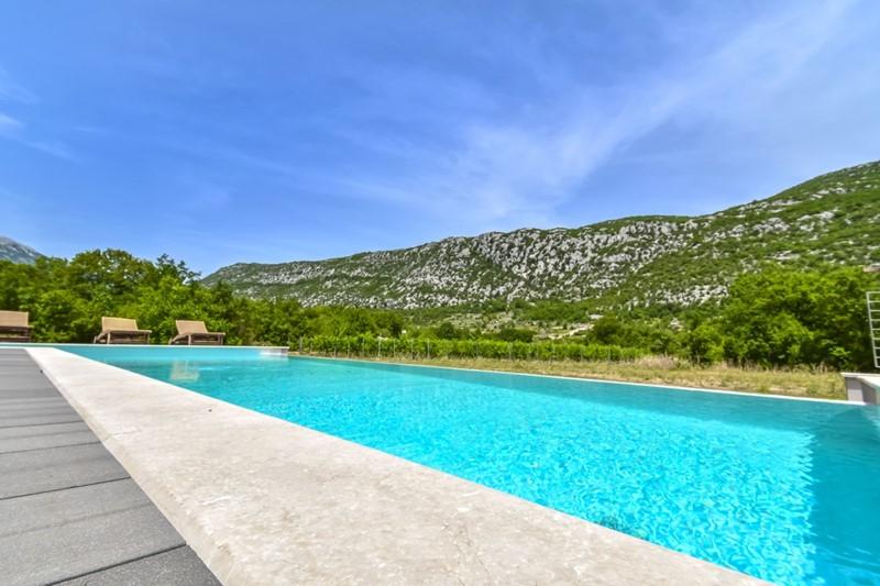 Vila byla postavena v roce 2020 a na první pohled si na exteriéru všimnete dokonalého spojení té nejlepší architektury a nedotčené přírody. Vzhledem k jeho odlehlé poloze můžete relaxovat při opalování a koupání ve velkém bazénu před vilou. Vyhřívání bazénu je volitelné a je k dispozici pouze na předchozí vyžádání (od konce května do začátku října). Pro ještě větší potěšení je ve venkovním prostoru krb s grilem a jídelním nábytkem, takže si můžete vychutnat přípravu lahodných dalmatských specialit.