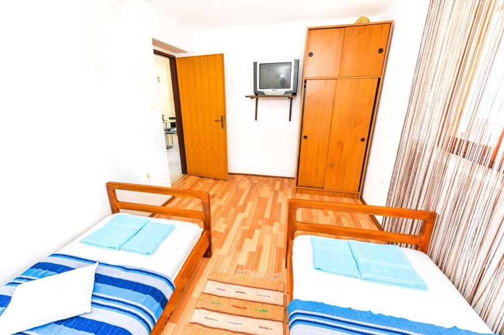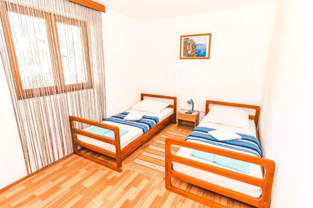 APT 2/2+2 (60 m2) - Apartmán disponuje velkou příjemnou terasou (30 m2) a nachází se v přízemí domu. Skládá se ze 2 ložnic, denní místnosti s kuchyňským koutem a jídelnou a koupelny se sprchou. V jedné ložnici je manželská postel a ve druhé jsou dvě samostatná lůžka. V denní místnosti je rozkládací pohovka pro další 2 osoby. Apartmán slouží pro max. 6 osob. Hostům je k dispozici velká zahrada s terasou, bbq grilem a místem na piknik s výhledem na moře. Vybavení apartmánu: klimatizace, topení, SAT TV, WIFI, ručníky, ložní prádlo, trouba, lednice, mrazák, bbq gril, zahradní nábytek |